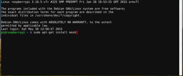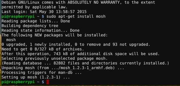 El Raspberry Pi comenzará instalando Mosh. (Es posible que pide una confirmación, respuesta solo con "y" y "Enter".) Ahora espere a que el indicador de comandos volver a aparecer.
