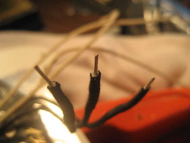 Aquí estamos utilizando alambre de paño "rechazan" de estilo vintage. Puede desplazar hacia atrás la tela exterior para revelar el cable interior. Para los demás hilos recolección revestidos plástico, usted necesitará utiliza un pelacables. Deje aproximadamente 1/4" para soldar.