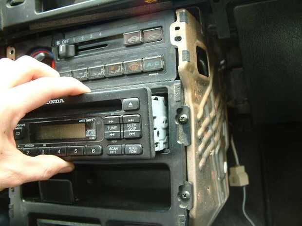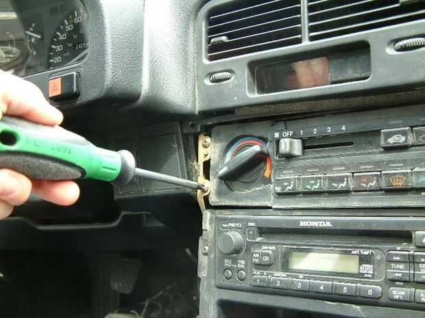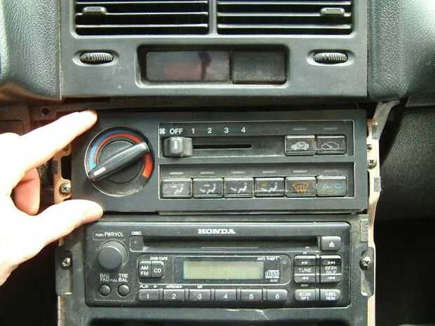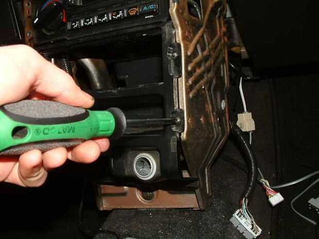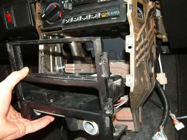 Ahora puede ver cómo se monta la unidad de control de clima, y cómo la placa se ajuste a la unidad. Quite los tres tornillos que sujetan la unidad de control de clima para el soporte de la consola de centro. Remueve la radio. Retire los cuatro tornillos que sujetan la radio surround y bolsillo inferior para el soporte de la consola de centro. Retire el anillo de radio tirando hacia fuera. Desconecte el conector de 4 pines en la parte posterior de la envolvente de la radio.