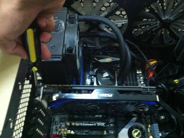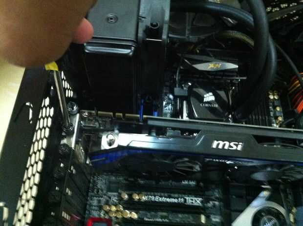 Este es mi fiel Geforce GTX 260. Ha visto mejores días, el recinto ha sido hackeado para arriba para que quepa en una placa base que no debería haber estado nunca en. Normalmente ese agujero tiene cinta de pato Bubba Billy. Pero de todos modos cuando