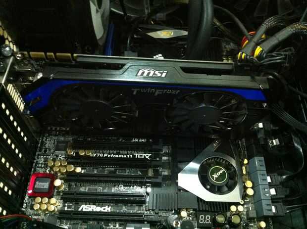 Este es mi fiel Geforce GTX 260. Ha visto mejores días, el recinto ha sido hackeado para arriba para que quepa en una placa base que no debería haber estado nunca en. Normalmente ese agujero tiene cinta de pato Bubba Billy. Pero de todos modos cuando