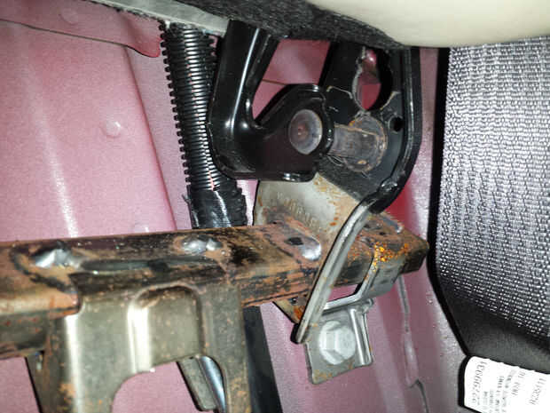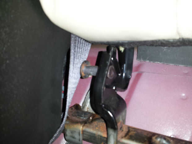 La parte del respaldo del asiento es sostenida en lugar por dos clips en el parte superior atrás, uno a cada lado. Empuje la parte superior del asiento hasta comprimir clips y tire directamente hacia afuera liberando la parte superior del respaldo. Ahora se une el respaldo por el clip circular con una pista que agarra el perno redondo en la parte inferior del asiento. Tenga cuidado de no romper o perder a los espaciadores de plástico pequeños que recorren el clip en el asiento. Suelte con cuidado el respaldo de los clips levantando hacia arriba y fuera de pista. Quitar respaldo y colocar un coche lateral.