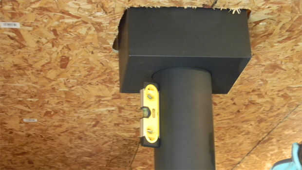 Ahora que hemos atravesado el techo, deberemos marcar el agujero para penetrar a través del techo. Deslizando una sección de tubería de estufa de pared simple con un nivel que son capaces de marcar el donde se haga el orificio a través del techo. Pasando un tornillo de la cubierta de la azotea hará fácil identificar donde se necesita cortar el agujero en el techo.