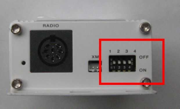 Ahora deberá configurar la caja de interfaz para trabajar con la radio. Hay una serie de cuatro interruptores en el lado de la caja de interfaz que dirá cómo comunicarse con la radio. En un Corolla 2000-2006 estos interruptores deben todos estar indicando en.