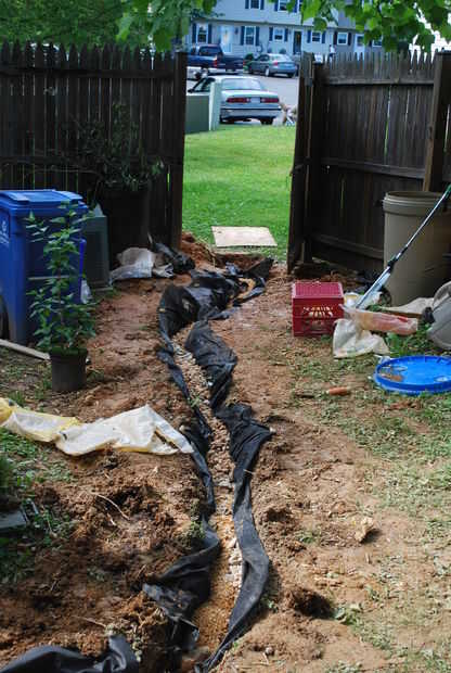 Una vez que se excava, obtener su agua hacia fuera y el balde o manguera. Prueba de su drenaje. Asegúrese de que el agua fluye en la dirección correcta y a la velocidad adecuada. abre las zonas pegadas. Claro la trinchera de palos exceso y raíces (habrá muchos). Una vez que se ejecuta lo que te gusta, listo para la tela y las piedras.