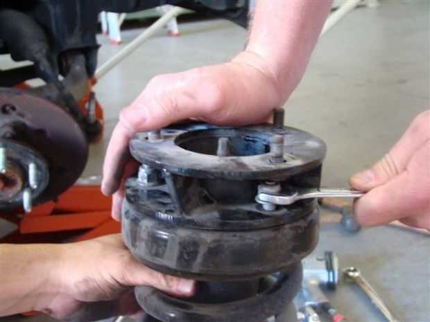 Ahora, se puede quitar la tercera tuerca de montaje del puntal superior. Esto le permitirá maniobrar el conjunto todo choque el carro. El espaciador puede montarse luego en la parte superior de la descarga. El espaciador debe vienen con un conjunto diferente de las tuercas. Tuercas de fábrica deben ser utilizadas con los pernos de fábrica. A su vez, las tuercas de espaciador deben usarse con los postes del espaciador. Use Locktite® en los seis pernos y tuercas de fábrica y las nuevas tuercas de espaciador a 35 lb-ft de par (48 Nm) usando la llave dinamométrica.