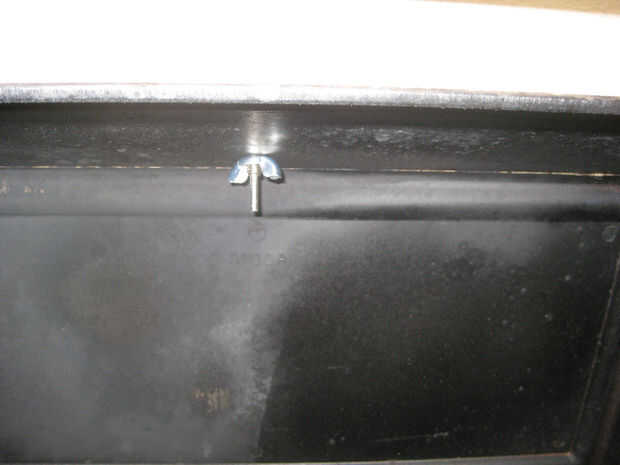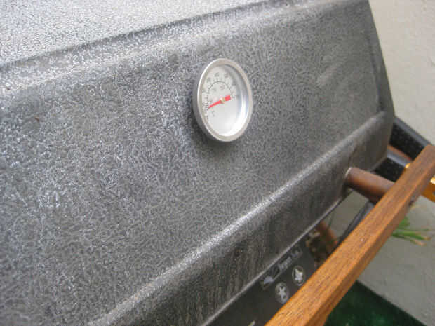 La parte posterior del indicador está roscada con una tuerca de mariposa para mantener en su lugar. Retire la tuerca de mariposa, los hilos de rosca del palillo por el agujero y apriete la tuerca de mariposa en el interior de la tapa de la parrilla.