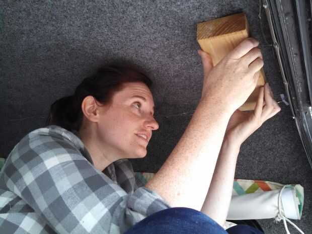 En primer lugar, pongo la rejilla sobre la cáscara del campista, asegurándose de alinear en todos los lados. Luego pegó cinta del pintor azul debajo de cada pie de anclaje marcado los lugares para los orificios de montaje y retirar la rejilla. Aquí es el proceso que utilizan para perforar a través de la fibra de vidrio, que resultó para ser super fácil: