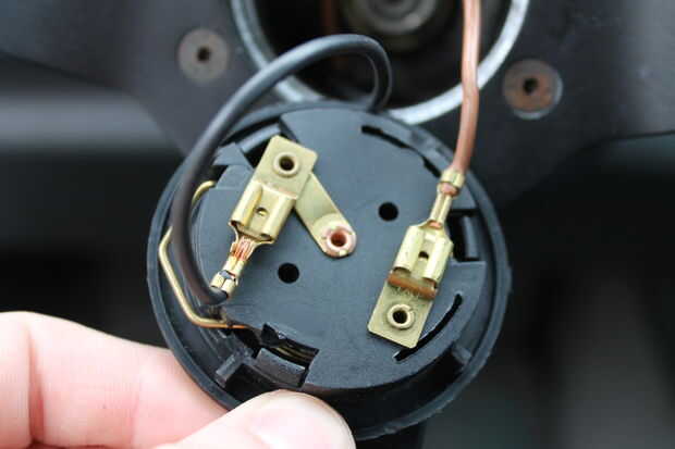 Agarre y tire el cuerno con la mano hasta que saca el cuerno. Si tienes dificultad para hacerlo, puede apalancar suavemente bajo el anillo de plástico con un destornillador de ranura recta pequeña. Tenga cuidado cuando curiosos para que no se rasque o dañar su cuerno en el proceso. Usted puede necesitar suavemente alrededor del perímetro para liberarlo. Después del retiro, tomar una foto de cómo están conectados los cables. Utilizar esto más adelante para referencia. También puede etiquetar o escribir cómo fue conectado para referencia adicional. Ahora desconecte los cables y retire el cuerno.