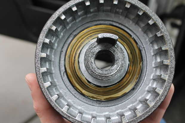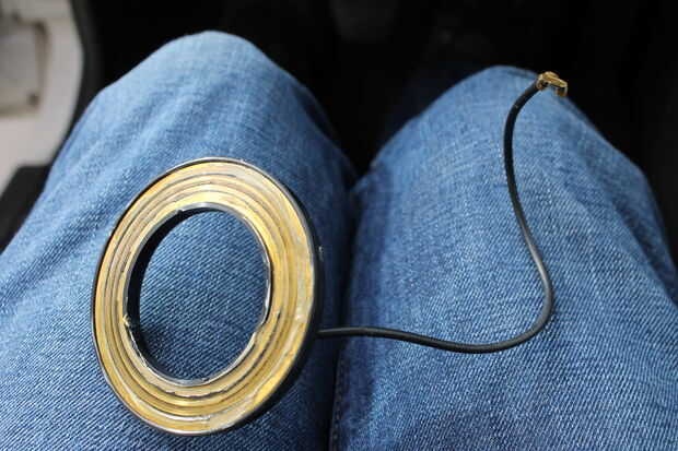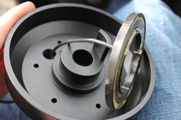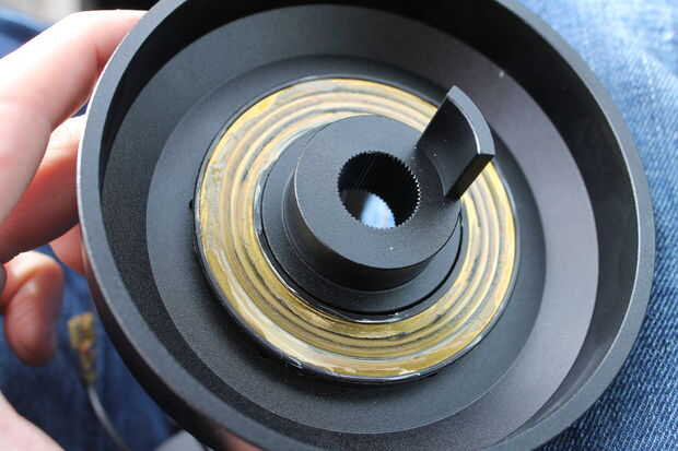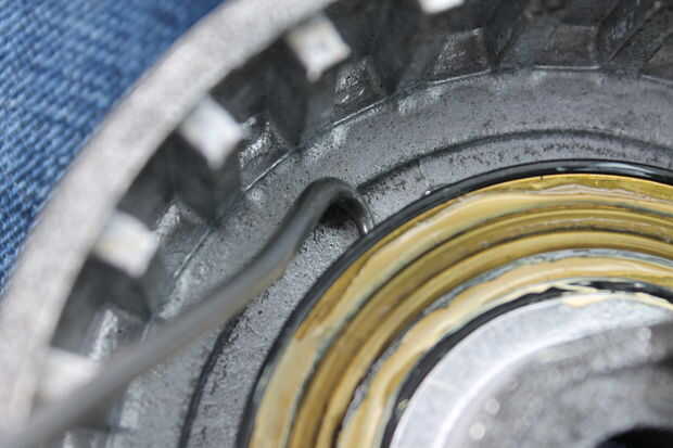 El anillo de oro (imagen 1), es desmontable y es necesaria para la nueva Asamblea. Para quitar el anillo, utilice el pico de gancho pequeño para meterse en el ring (cuadro 2). Usando un patrón diagonal, haga palanca suavemente en pequeños incrementos. Este paso debe hacerse lenta y correctamente, ya que esta parte es fundamental y necesaria en la nueva Asamblea. Una vez retirado el anillo, usted encontrará tiene un cable negro que se le atribuye (cuadro 3). Este cable se puede pasa ahora por el eje corto (cuadro 4). Luego deslice el anillo en posición (Figura 5). Ahora estás listo para pasar al siguiente paso.