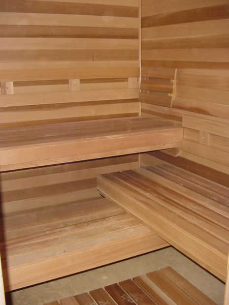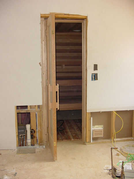 En los planos originales de la casa había un armario de almacenamiento fuera del garaje donde la pared posterior del armario realmente labradas la pared posterior del cuarto de baño principal por lo que hemos construido la sauna dentro del armario algo así como un cuarto dentro de un concepto donde nosotros podríamos aún acceder al exterior y el techo de la sauna a través de la puerta del armario en el garaje. Instalamos la puerta a la sauna sí mismo dentro del cuarto de baño. Aquí es antes de la teja.