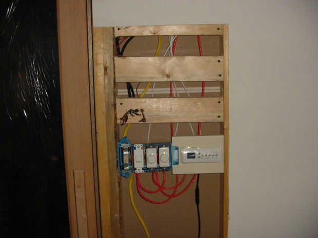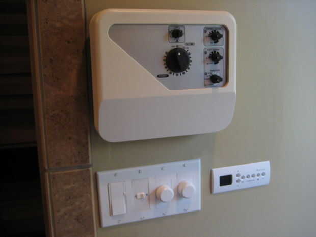he instalado también un sistema de audio de toda la casa con un par de altavoces y control de volumen en cada habitación impulsado por un amplificador central por lo que he instalado un interruptor de B en el panel de control fuera de la sauna junto con el control de volumen de audio de toda la casa así que usted puede cambiar entre TV audio y audio de toda la casa.