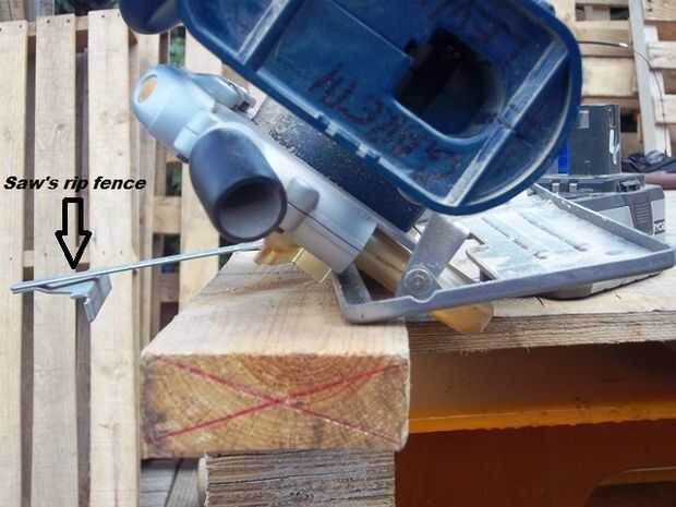 Ajustar la sierra para cortar a 45 * y luego poner el rip valla corte guía para que la hoja corte a lo largo de la línea del inglete. Por favor, recuerde que la sierra desenchufada cuando se configura, o en mi caso la batería quitada de mi sierra circular sin cable... la madera es mucho más barata que los dedos!