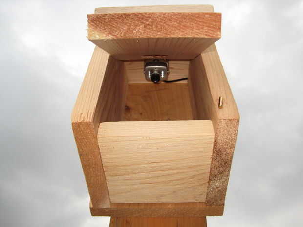 Mi padre compró una pequeña cámara espía inalámbrica de uno de su bluebird casas y mi ayuda lo instale.  El problema es que a pesar de que la cámara inalámbrica era solamente cerca de 30 pies lejos el receptor inalámbrico, la imagen era muy staticky y también muy granulada ya que estaba oscura dentro de la pajarera.  También era difícil de instalar la cámara porque la pajarera era grapada por lo que no lo desarma sin rasgado para arriba.  También tuvimos que ejecutar un cable a la pajarera para encender la cámara ya que no era factible cambiar lo cotidiano de la batería.  Decidí que puesto que tuvimos que correr un cable a la pajarera de todos modos, por qué no seguir adelante y utilizar un cable de la cámara con luces infrarrojas así que pudimos ver el interior de la pajarera de día o de noche.