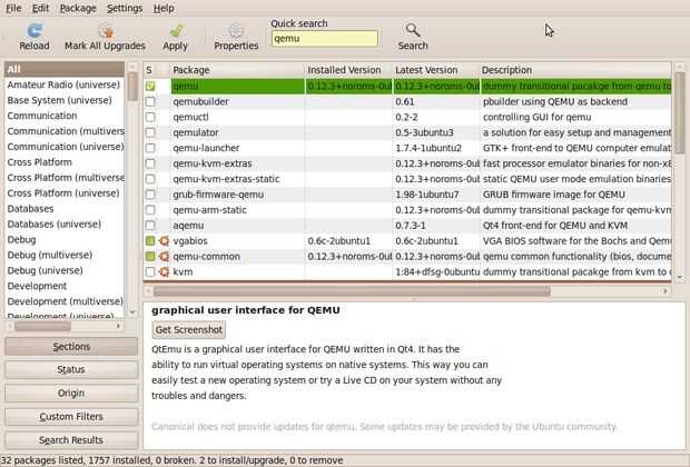 Se le pedirá una contraseña y luego usted puede elegir los paquetes. Tipo en qemu en el cuadro de búsqueda rápida. A continuación aparecerán todos los paquetes que tienen que ver con qemu.