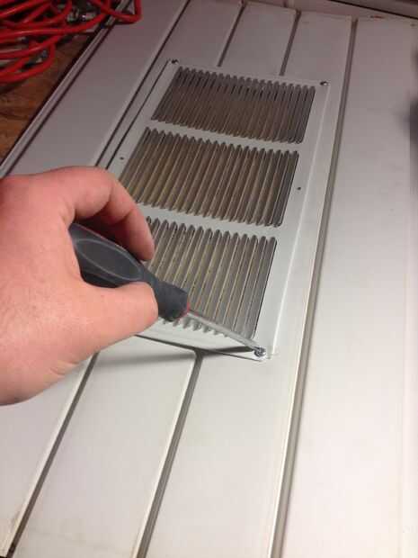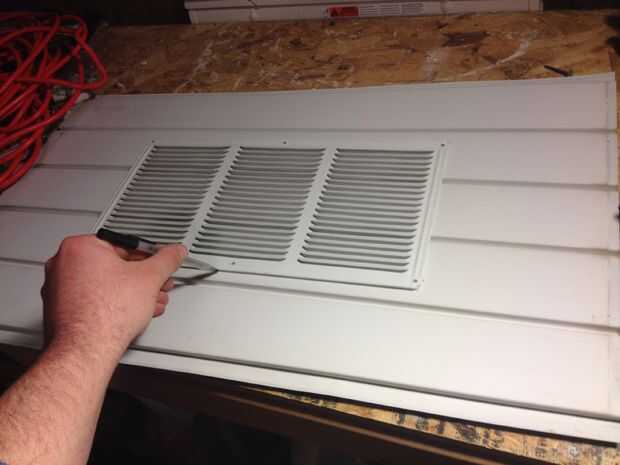 Bien así que ahora la parte importante - usted quiere colocar la rejilla de ventilación (si tiene revestimiento como yo) centrado en el panel.  Traza suavemente alrededor de la rejilla de ventilación, marcar los agujeros de tornillo.  No quiero cortar esta línea aunque más como 1/4" dentro de la línea. Si se corta a lo largo de la línea, la ventilación sólo caerá ya que no tienes nada a que.  ¡ Simple!  Es de mi revestimiento de vinilo en la casa, pero aluminio bajo el alero, así que usando un cuchillo de la manía y unas tijeras afiladas hizo el trabajo bien.  Atornille con tornillos de acero inoxidable para protección contra la intemperie