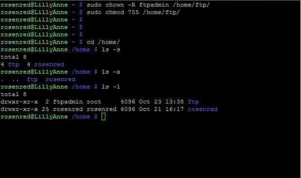 El resultado de estos dos mandamientos es que el dueño del directorio (ftpadmin) tendrá acceso completo al directorio y los archivos dentro y el resto del mundo sólo acceso de lectura. Hacer un ls -l y deberías ver algo como el tercer cuadro (que también me olvido el interruptor adecuado para el comando ls muestra: P)