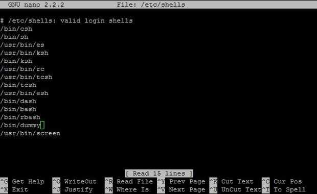 Ahora, tenemos que añadir los usuarios, pero primero vamos a asegurarse de que lo único que pueden hacer los nuevos usuarios inicie sesión en nuestro servidor FTP. Cuando se crea un nuevo usuario de Linux, se le asigna un shell por defecto que va a utilizar. Si no estás seguro de lo que estoy hablando, tómese un minuto para leer un poco sobre conchas . Usando su editor favorito, abra/etc/shells del archivo y agregar uno no existente. Mina "dummy" nombré como veis en la imagen siguiente.