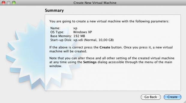 La configuración por defecto funciona para muchas aplicaciones, utilice un disco duro más grande, si desea instalar más programas o mas RAM, si tu Mac tiene suficiente. He creado con 192 MB de RAM y un disco duro de 10 GB (después de instalar Windows y todas las actualizaciones, el disco necesita unos 4 GB):