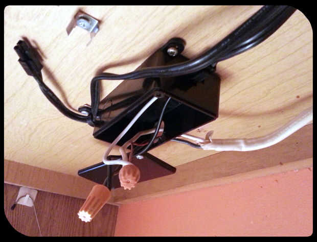 Después de montaje y montaje de la caja y clips, pase los cables de la casa a través del hoyo proporcionado en la caja negra. Usando las tuercas para alambre guardados, conecte los cables negros juntos. Lo mismo para los cables blancos, pero incluyen el cable de tierra. El aparato antiguo tenía un cable separado de tierra por lo que fue puesto a tierra la caja de metal. Puesto que este accesorio es en gran parte el plástico, que no es necesario, pero todavía quieren nuestra conexión a tierra.