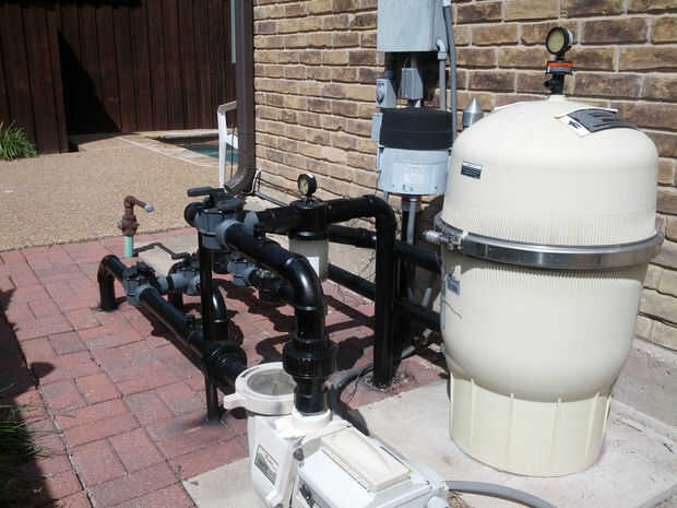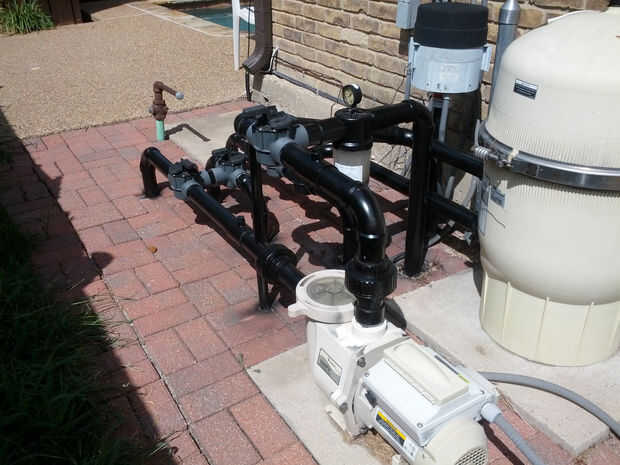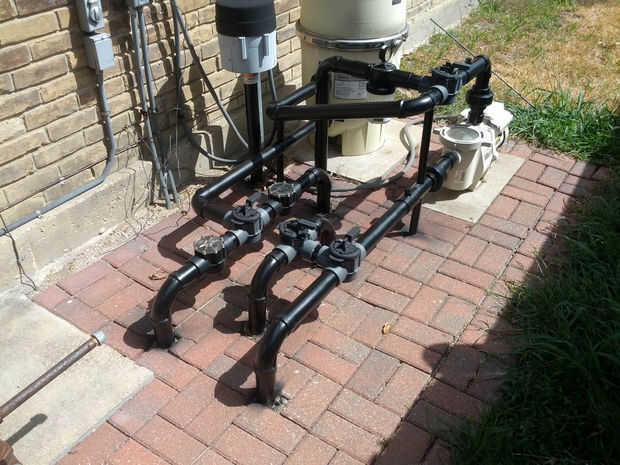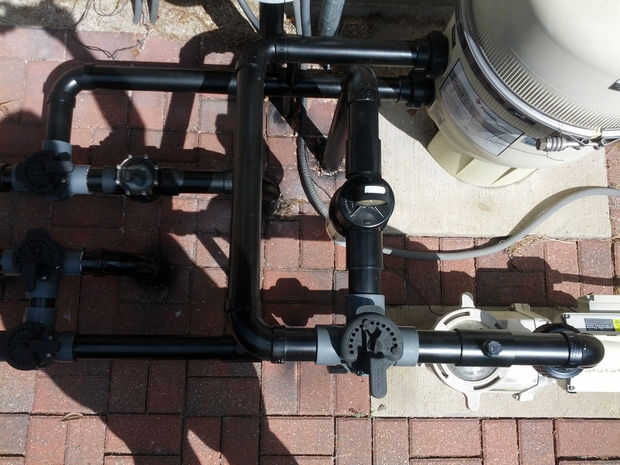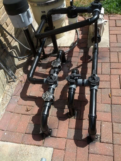 El plan original había llamado siempre para pintar el tubo para protegerlo del sol. PVC amarillo y quebradizo si se dejan en luz directa sol. Me tomó un par de años para finalmente llegar a la pintura de la tubería. He utilizado unos botes de spray negro de brillo para las piezas plásticas... Usé cinta de pintor azul para proteger las cosas quería conseguir pintura en y rociar el resto. Probablemente debería haber protegido los adoquines demasiado... pero tengo pereza por lo que hay en aerosol sobre los adoquines al lado de la tubería que entra en el terreno. Figura que desaparecen en pocas semanas o puedo sólo entregar los ladrillos.