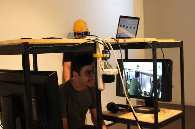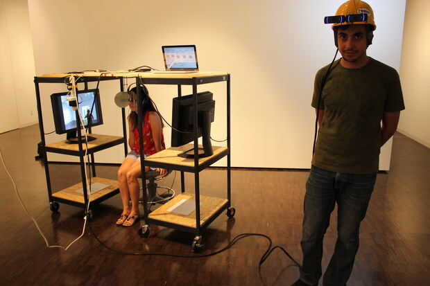La primera es usando video en vivo. Las fotos arriba son de una instalación que hice uso de webcams para crear una experiencia estereoscópica en vivo. Las señales de webcam ir a un PC donde ellos son manipulados en Max con varios efectos antes de que se muestra en los monitores. De esta manera, dos personas trabajen juntas como un sistema visual: como los ojos, el otro como el cerebro. El parche de Max (hecho con la ayuda de Takuma Takahashi) toma las dos alimentaciones videos y les aplica un retardo aleatorio y el efecto de muestreo. Esto produce un efecto incómodo para el espectador como los interruptores de percepción incontrolablemente entre 3D nítida y una visión corrupta de intervalos de tiempo y visión doble. Es este equilibrio en el proceso perceptual entre la síntesis y la rivalidad de información que espero que los participantes pueden experimentar.