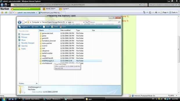 Para preparar correctamente la tarjeta sd (asumen que ya con formato, si no siga el enlace en la lista de fuentes thundaboys instructable.) necesita hacer una carpeta llamada "apps" sin las comillas y una carpeta llamada "wad" sin las comillas. bien la función de la nota de fotos no funciona en mi computadora, pero figura que se obtiene lo esencial de lo que im tratando de decirle. primera foto es raíz de la tarjeta sd. 2 º es la carpeta de aplicaciones. ahora esta es mi carpeta de aplicaciones, y si no lo has hecho homebrew antes, usted sólo debe tener manager wad 1.3 aquí, como se puede ver resaltada por el ratón. 3 carpeta wad, mi taco es la leyenda de zelda ocarina de la búsqueda principal de tiempo. Elegí ese taco porque, ya que nintendo no hacerlo, no se puede llamar piratería en usted para robarlo. también al descargar el administrador de taco, puede copia la carpeta de manager wad en la carpeta Aplicaciones y si el archivo dol no se llama boot.dol, ir a la carpeta de wad manager y cámbiele el nombre a boot.dol.