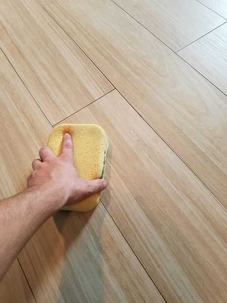2. Utilice una esponja ligeramente húmeda y limpie las caras de las baldosas.