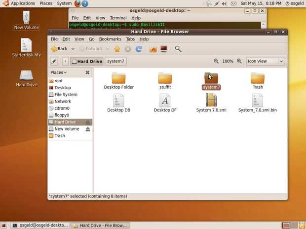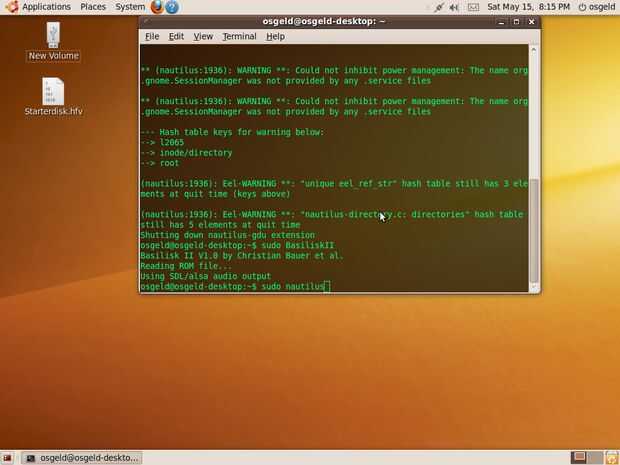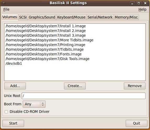 una vez que los archivos de imagen el sistema de archivos de linux que puede cerrar la ventana del explorador, desmontar la unidad y volver a la ventana de terminal y reinicie basilisk II (sudo BasiliskII). Aparecerá la misma ventana de configuración, bajo volúmenes quitar todos los anuncios