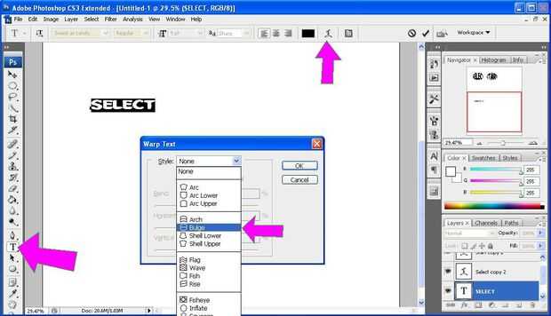 3. Resalte el texto y utilizar la herramienta "Deformar texto", estilo "Abultamiento" y ajustar los controles deslizantes hasta que gusta lo que ves.