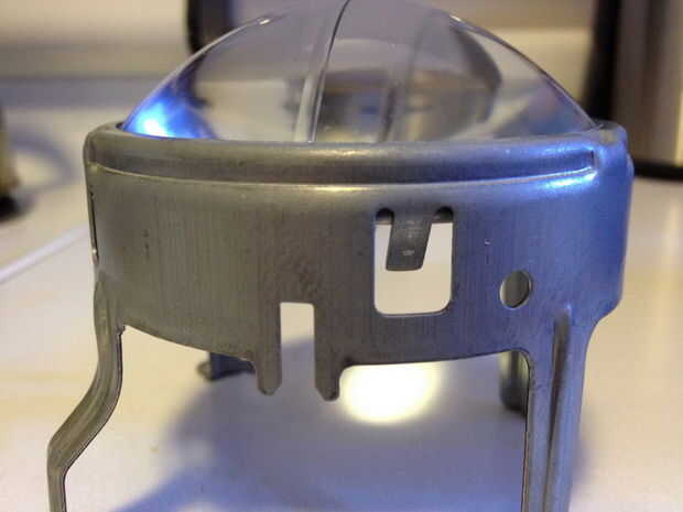 Instale los nuevos lentes doblando las pestañas que sujetan la lente en su lugar. Coloque la nueva lente. Vuelva a instalar el protector de corte y la Asamblea de sostenedor de la lente en el reflector proyector.