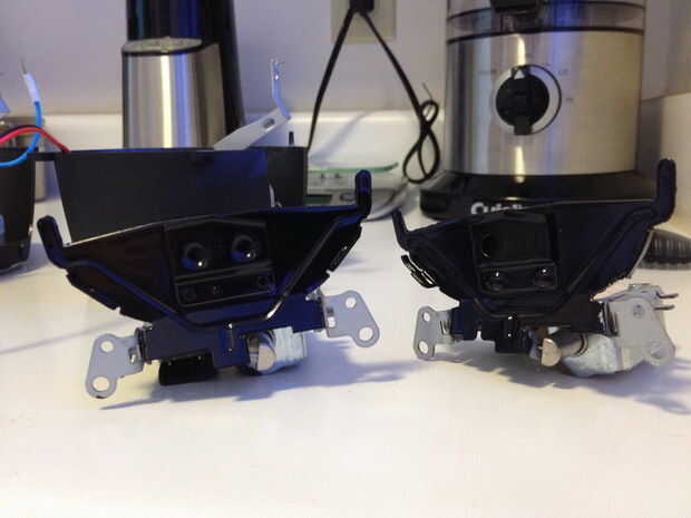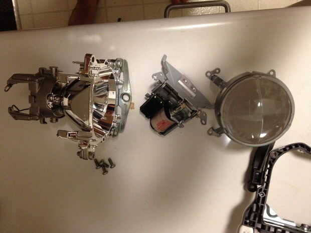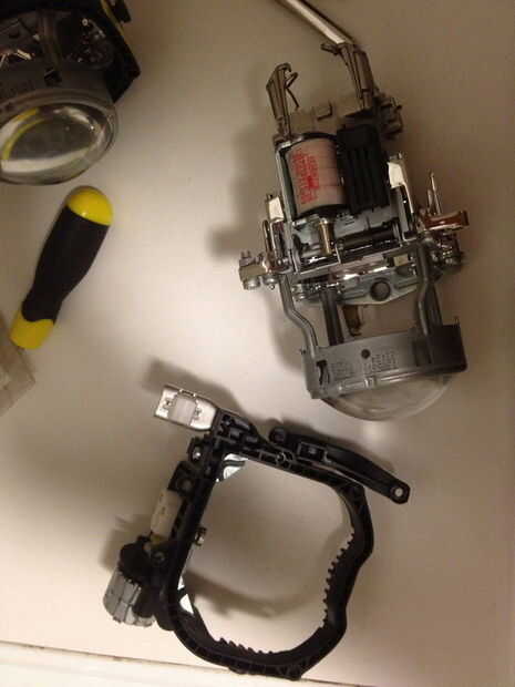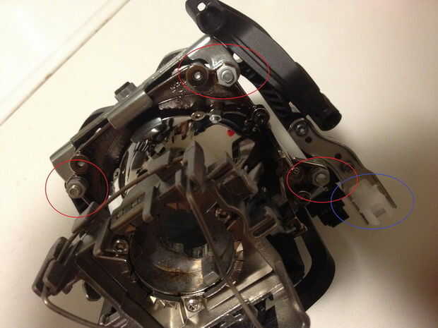 Desmonte el conjunto del proyector. Usted puede quitar la jaula de plástico negro y los tornillos en un círculo en rojo.