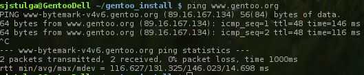 Una vez está conectado a la red, hacer ping a la Página Web de gentoo para confirmar la conexión a internet: