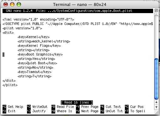 pasta "sudo nano /Library/Preferences/SystemConfiguration/com.apple.Boot.plist" (sin comillas)