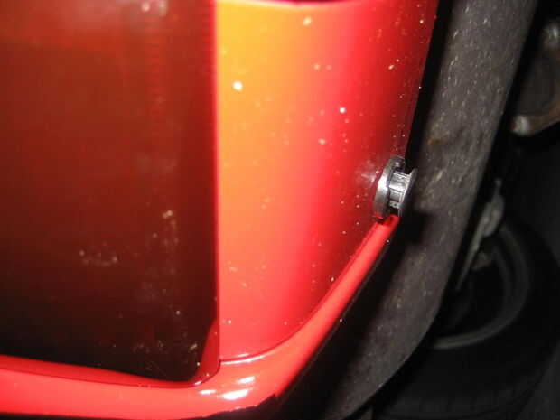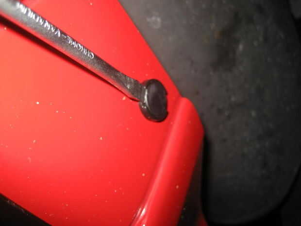Tome un destornillador de cabeza plana y pop un sujetador situado bajo el parachoques.