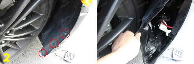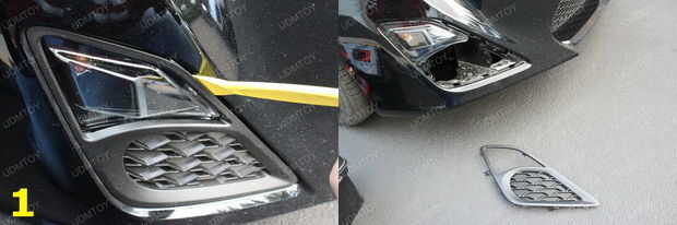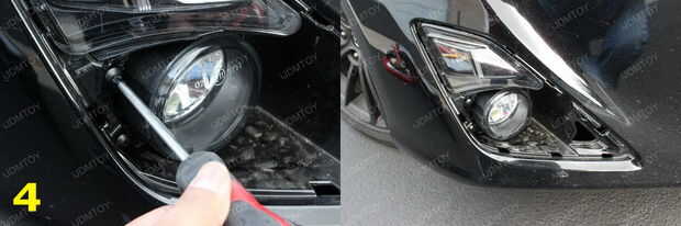 4.) Instale la niebla luz Asamblea por bloqueo de primera en las dos pestañas a la derecha en la fábrica de parachoques. Utilizar las herramientas suministradas para montar el tornillo en el tope con un destornillador de cabeza Phillips.