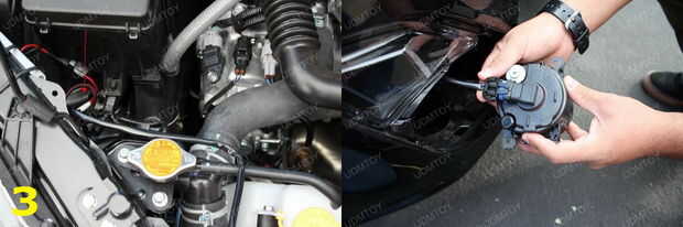 3.) utilizando los cables suministrados, uno de los tapones de H11 dirija hacia abajo hacia la zona de luz de niebla. Conecte el arnés a la luz de niebla.