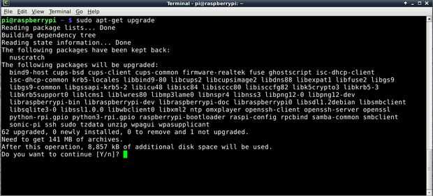 Primero debemos descargar la imagen de Raspbian. Luego con Gdiskdump o Win32 Disk Imager debemos escribir la imagen en la tarjeta SD de 8gb. Tras el primer arranque y configuración de nuestra frambuesa Pi debemos instalar todas las actualizaciones del software. Abrir un terminal en la Raspberry Pi y tipo sudo apt-get update y al terminar escribe sudo apt-get upgrade. Es muy importante tener todas las actualizaciones a nuestro Pi. Permite continuar con nuestro pc ahora