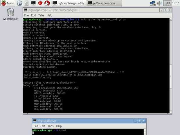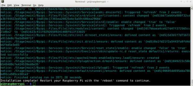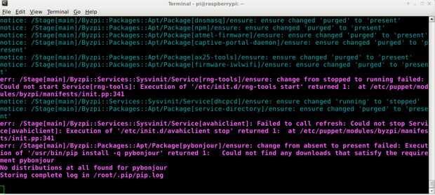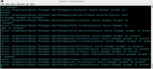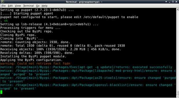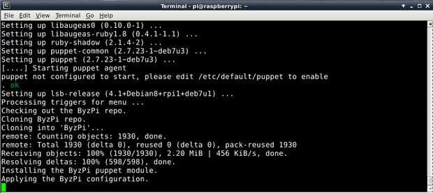 La instalación de ByzPi es muy simple pero lleva algún tiempo. Abrir un terminal en Raspberry Pi y escriba el siguiente comando: curl -s http://byzantium.github.io/ByzPi/install.sh | bash pulsar la tecla enter y habrá que esperar unos 40 minutos para hacer toda la instalación. Toma algún tiempo a ejecutar porque el guión hace un apt-get upgrade todo el systemware será hasta la fecha. Durante la instalación, verá un par de errores en el terminal. No puedo decirte Cuáles son estos errores, pero no detener la instalación, continúe hasta el final.