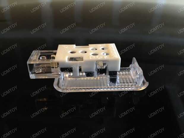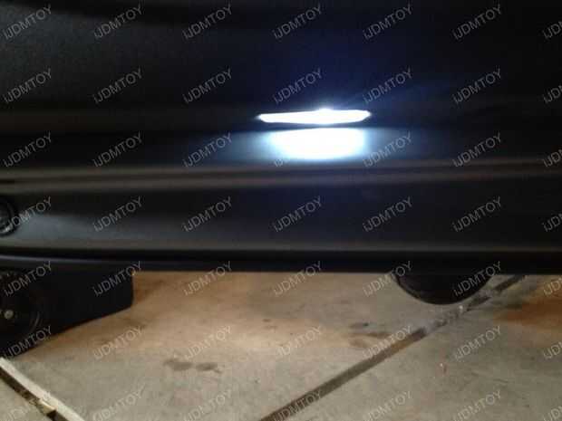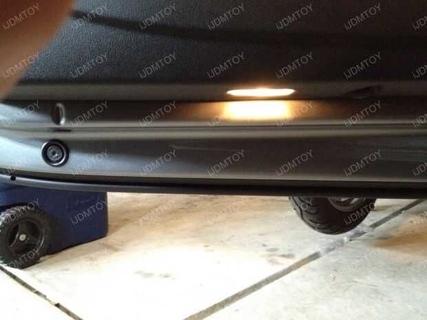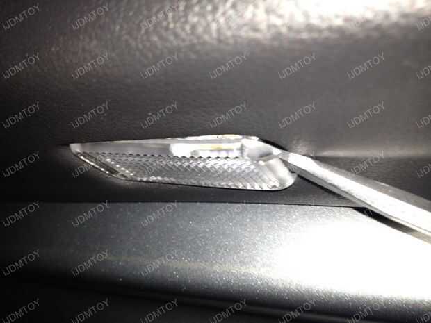 Luces de cortesía la puerta lateral: utilice una herramienta de palanca para quitar la cubierta luz cortesía puerta del lado. Pop de la pieza de plástico blanco en la parte trasera y quitar la bombilla de puerta lateral común. Sustituirla por la bombilla de LED cortesía de la puerta lateral.