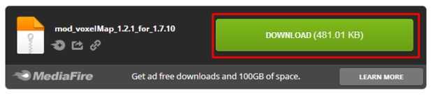 Antes de instalar voxelmap, necesitará descargar el mod en sí mismo. Se puede descargar desde el siguiente sitio web: http://www.mediafire.com/download/b5e5kfden8o55lc/mod_voxelMap_1.2.0_for_1.7.10.litemod, deberá pulsar el botón download para descargar voxelmap.