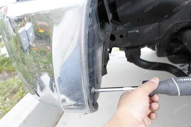 Lo primero que quieres hacer es que girar el volante hacia el lado opuesto que está trabajando. Si está trabajando en el lado del conductor, gire la rueda hacia la derecha y si está trabajando en el lado del pasajero, gire la rueda hacia la izquierda. Una vez que se trata de tomar un destornillador de cabeza Phillips y empezar a sacar los pernos que sujetan la tapa de plástico.