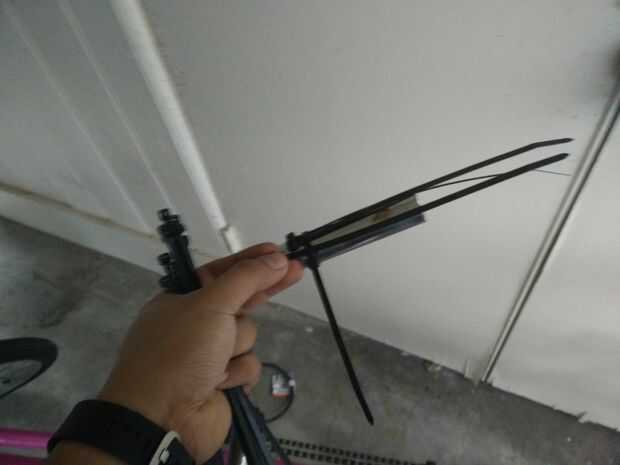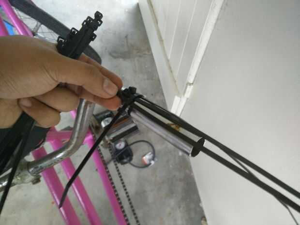 Lazo 1 zip lazo alrededor del manillar y tirar a "casi apretado". Debe ser lo suficientemente suelta para deslizarse más lazos, aunque lo suficientemente apretada como para mantenerlos.
