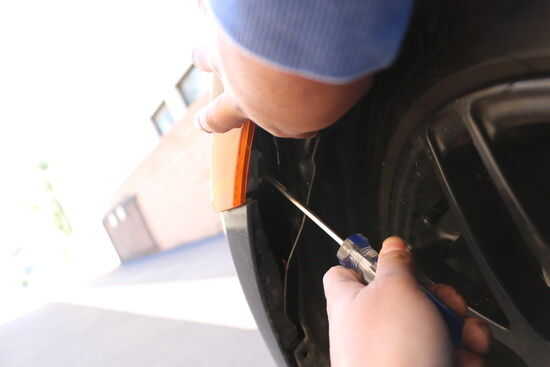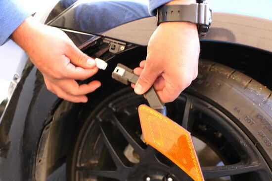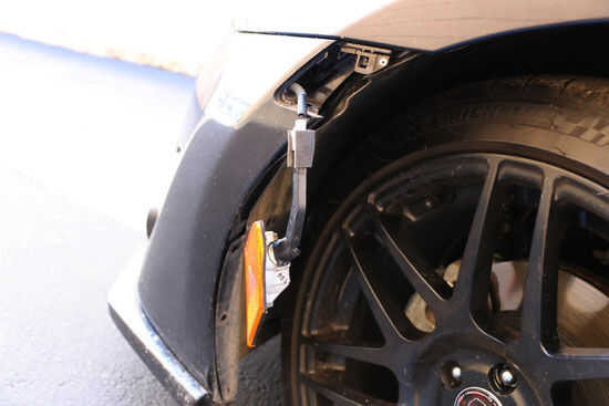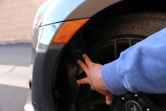 1) el primer paso sería arrancar el vehículo y girar el volante a la derecha para crear espacio para acceso a trazador de líneas del guardabarros del vehículo.