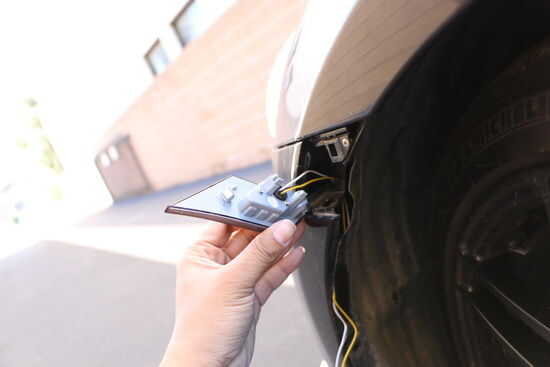4) aquí está una foto de comparación de la OEM y el conjunto del marcador lateral LED. Cuando instale al conjunto de LED en la esquina del parachoques, deslice los cables primero antes al posicionamiento en la nueva Asamblea de LED. Luego se alinee la unidad y pop volver con fuerza leve.