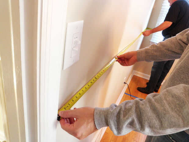 Por ejemplo, en esta foto están midiendo la distancia entre el marco de la puerta y la pared y luego la pequeña distancia entre la pared y ventana marco. Van a cortar dos piezas que componen la primera sección continua.