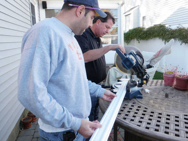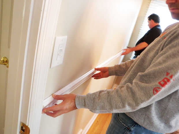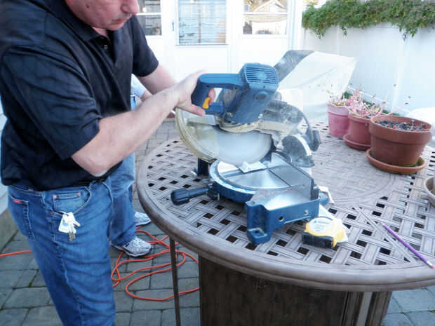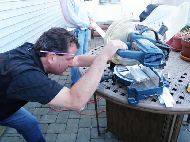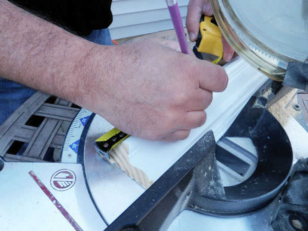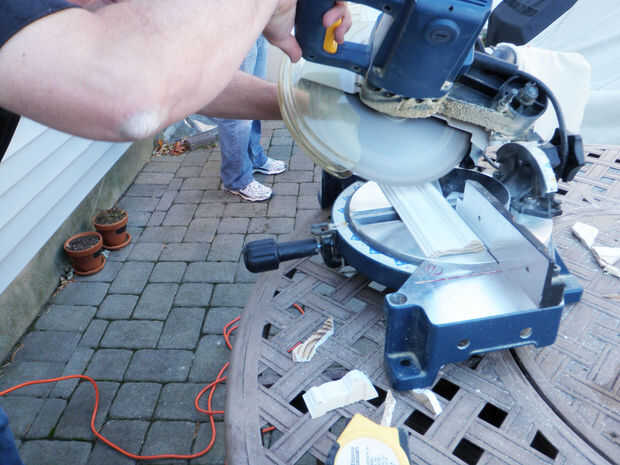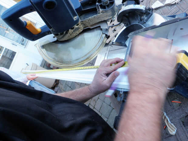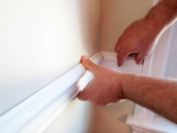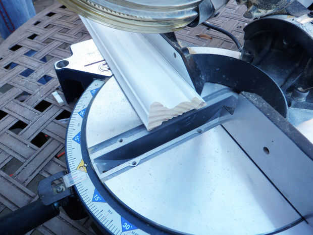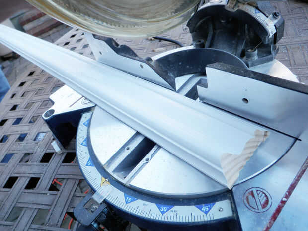 Para hacer esto, corte el extremo de una pieza a 45 grados y, a continuación, gire la siguiente pieza de moldura de modo que sigue siendo la misma cara hacia arriba, pero ahora aparece "boca abajo". Hacer otro corte. Estos dos cortes deben unirse a suavemente a 90 grados (ver notas de imagen).