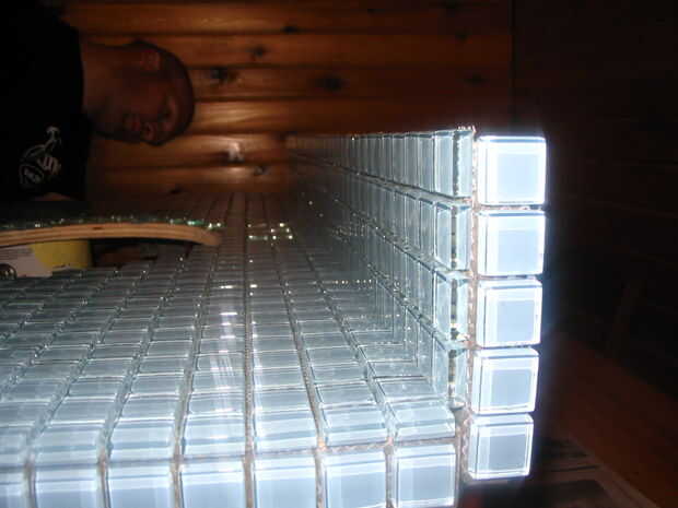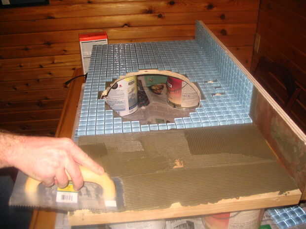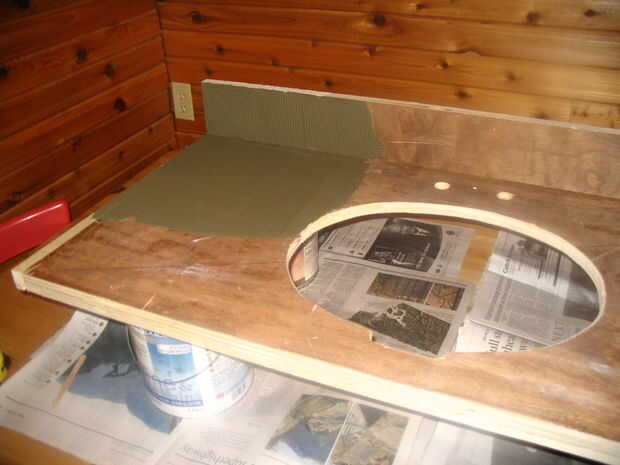 Había que trabajar bastante rápido, como el tiempo (el tiempo antes) era alrededor de 15 minutos. Hicimos esto en secciones. Pegamento (mortero de capa delgada) en la cuarta parte de la encimera, luego con las manos limpias, colocar las baldosas. Luego mortero de capa delgada más y más fichas. Trabajando rápidamente, colocar los azulejos, luego tuvo suficiente tiempo para trabajar alrededor, les mueva en su lugar para que no tenga esa 'fábrica' mirar. Otra vez, no queremos gente a mirarlo y ser capaces de distinguir claramente las secciones pie de azulejo.