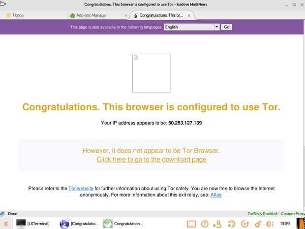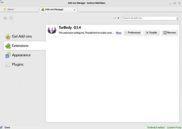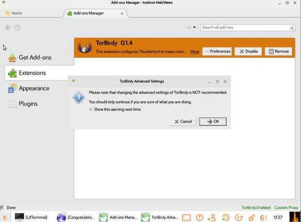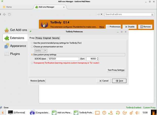 En la ficha Administrador de Addons haga clic en Buscar y escribe Torbirdy, instalar el Addon y haga clic en preferencias. Aparecerá un mensaje sobre cómo cambiar la configuración avanzada de Tor, pero está bien. Haga clic en ok y en la pestaña de Proxy al utilizar configuración de proxy personalizado a SOCKS host 127.0.0.1 puerto 9050, haga clic en configuración de proxy de prueba y otra pestaña aparecerá indicándole que usted está usando Tor.