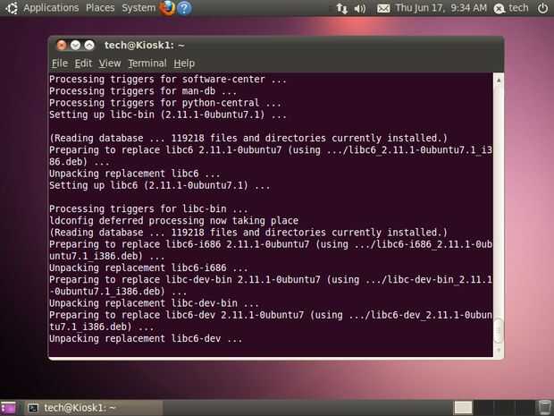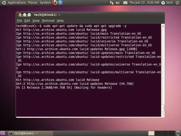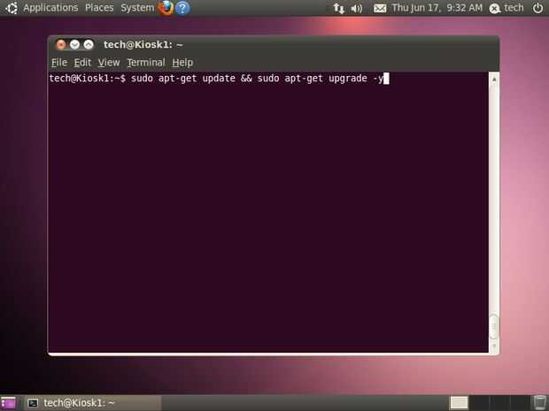 Haga clic en aplicaciones en la barra superior, luego resalte accesorios y haga clic en Terminal.  Esto debe traer una línea de comando estándar para Linux.  Entrada "sudo apt-get update & & sudo apt-get upgrade -y" en la línea de comandos e introducir tu contraseña cuando se le solicite.  La actualización asumen a partir de ahí, simplemente espere hasta que le deja al indicador y cerrar la ventana de Terminal.
